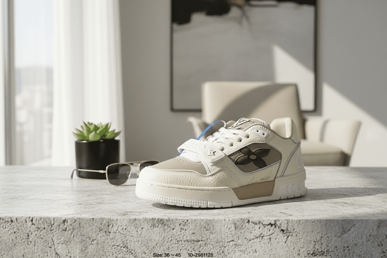 Louis Vuitton Men’s Designer Sneakers, premium leather casual shoes featuring LV flower pattern and embossed logo, lightweight comfort for street fashion and luxury style, sizes 36–45.