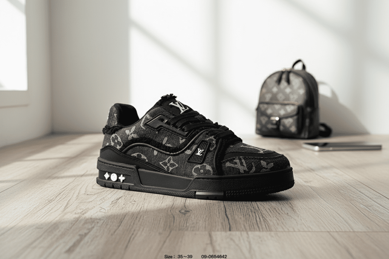 Louis Vuitton black monogram denim sneakers feature classic LV pattern, lace-up and velcro design, decorative buckle rubber sole, unisex, trendy, comfortable and perfect for daily casual wear.