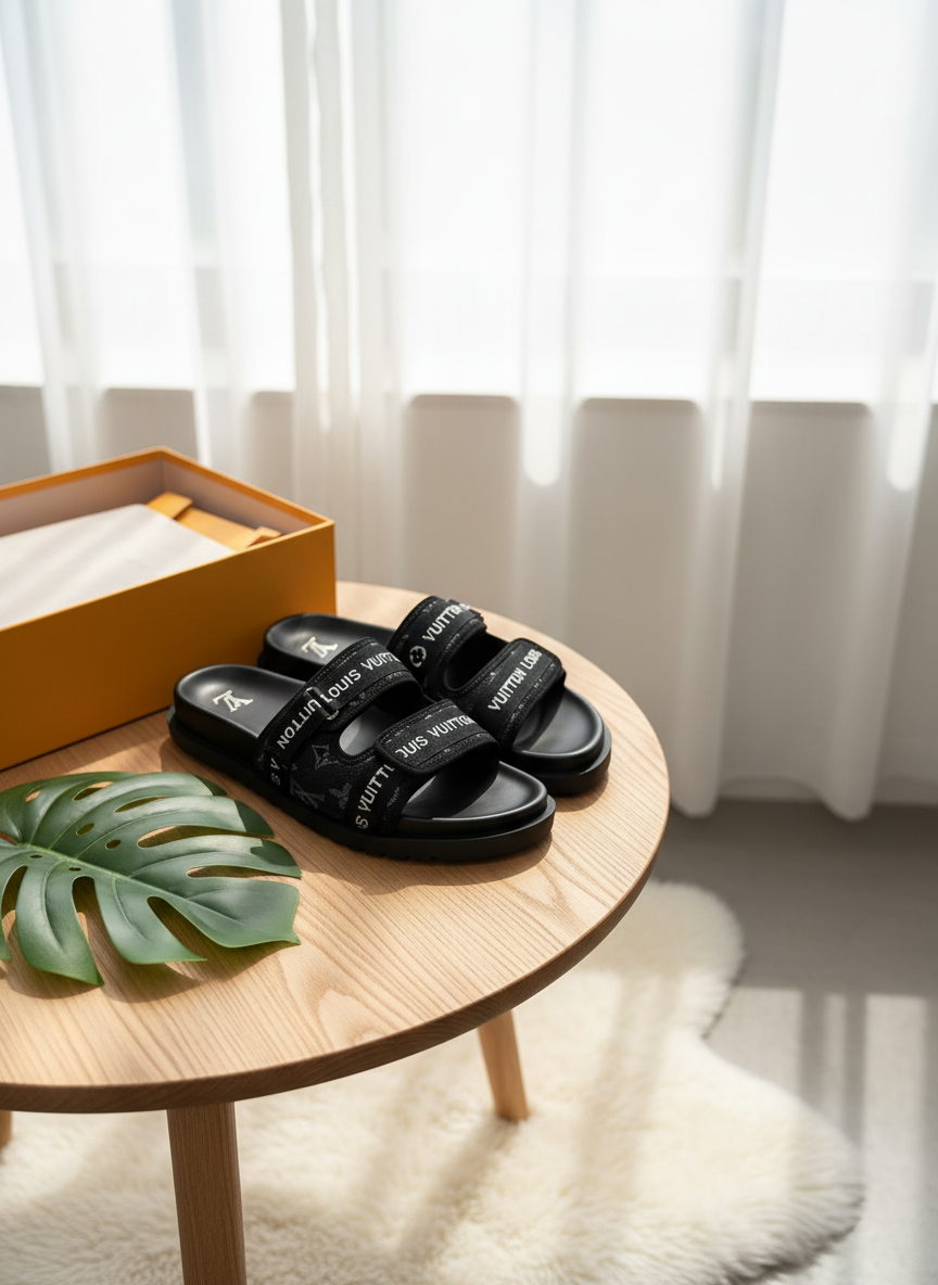 Louis Vuitton Black Double Strap Slides, made of fabric and rubber, featuring iconic LV monogram design. Unisex, versatile, and comfortable for daily wear at home or outdoors.