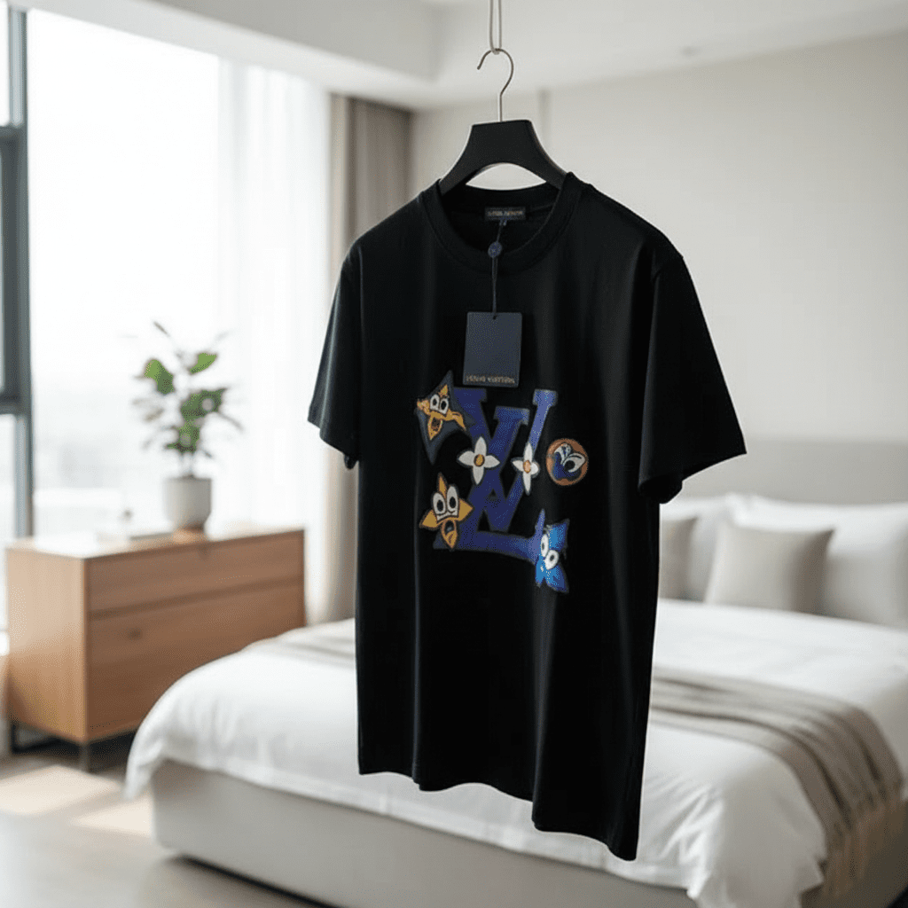 Louis Vuitton black cartoon collaboration T-shirt, made of premium soft breathable cotton, features a round neck, colorful cartoon print with brand elements, unisex style for trendy daily wear.