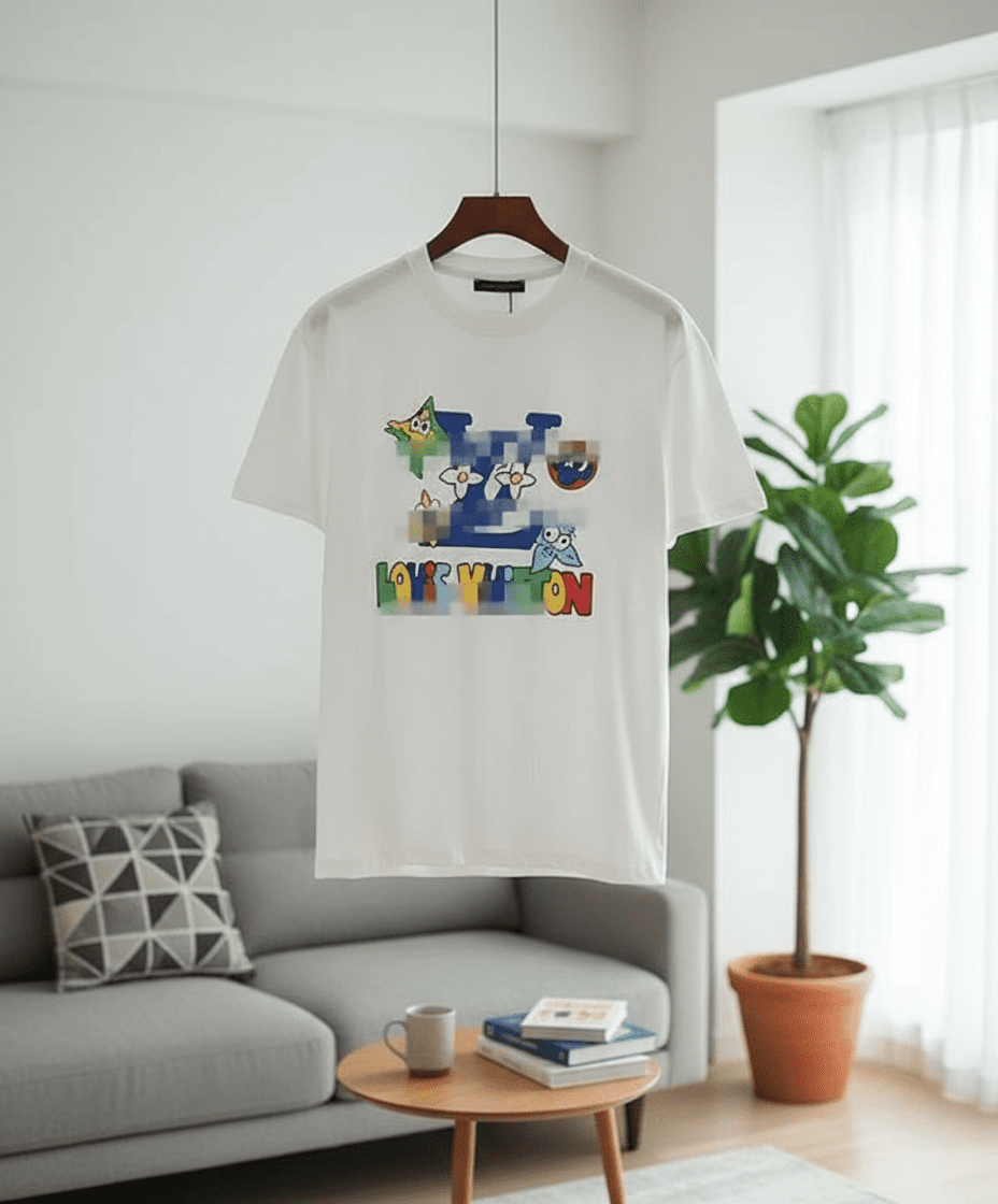 Louis Vuitton Kids Fun Series White Cotton T-Shirt, featuring colorful LV letters and cartoon motifs, unisex design, stylish casual wear, soft fabric, perfect for everyday outfits.