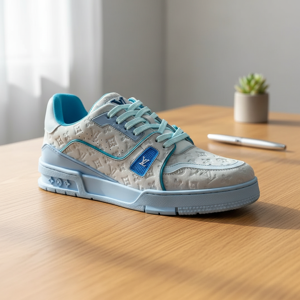 Louis Vuitton Light Blue Gray Monogram Embossed Leather Sneakers, low-top design for breathable comfort, durable sole for daily wear, unisex luxury style with signature LV fashion appeal.