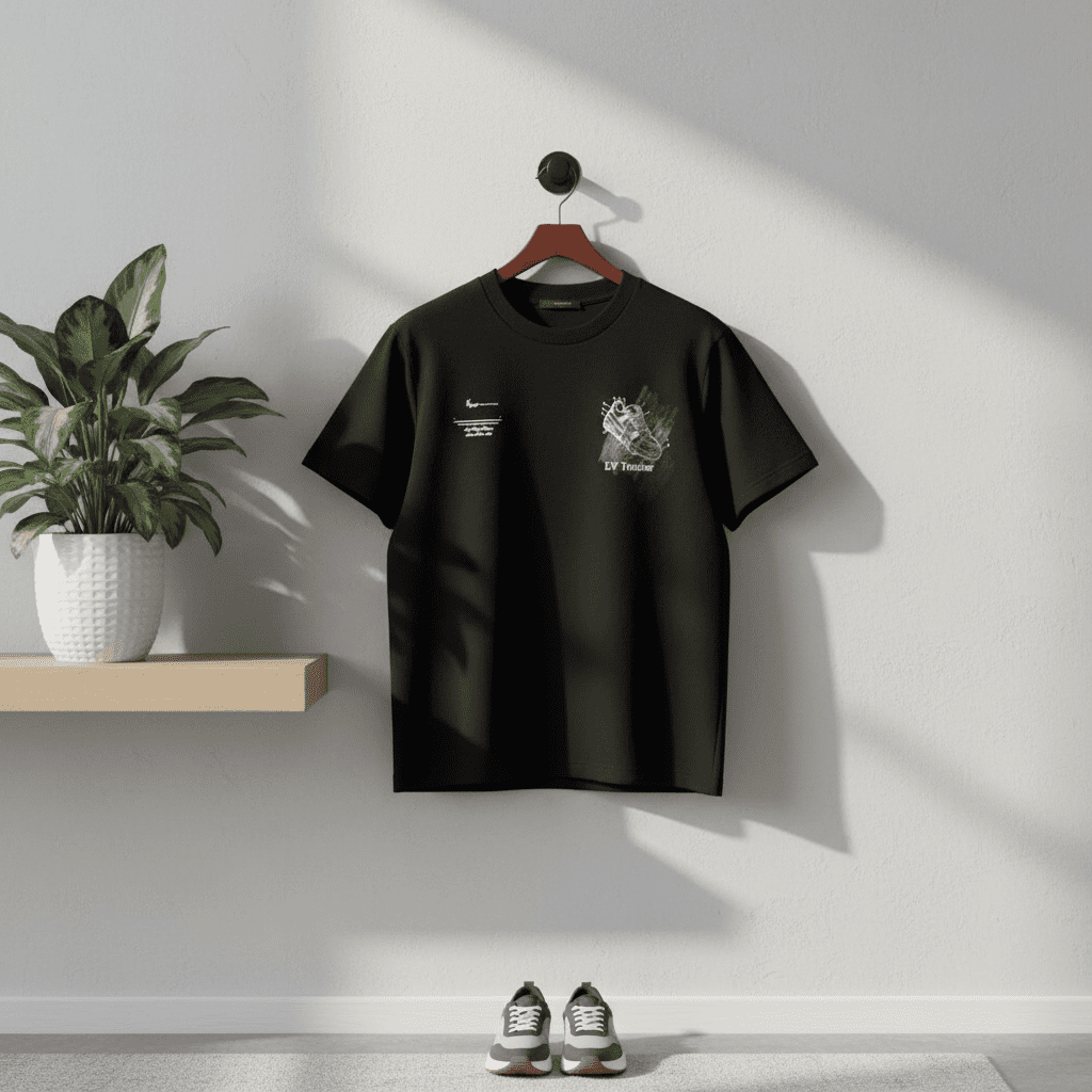 Louis Vuitton LV Trainer black T-shirt, crafted from premium cotton, features a minimalist front and detailed sneaker blueprint print on the back, offering unisex luxury and a contemporary streetwear vibe.