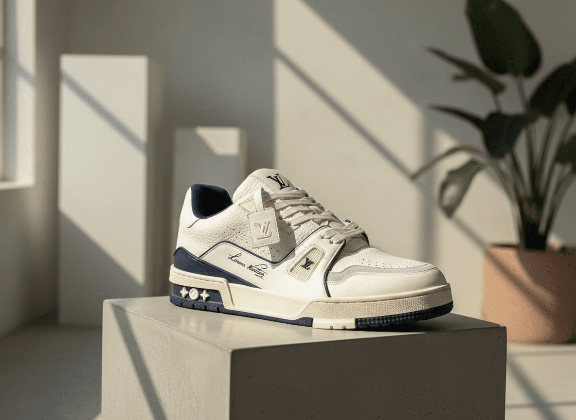 Louis Vuitton white and blue sneakers crafted from premium grained leather with iconic LV logo, signature details, and decorative sole accents. Unisex, breathable, luxurious, perfect for everyday fashion.