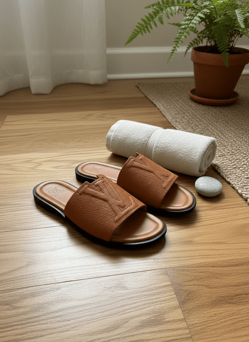 Louis Vuitton classic brown leather slides with signature LV monogram, soft breathable leather, open-toe design, anti-slip sole, unisex luxury comfort for casual home or outdoor wear.