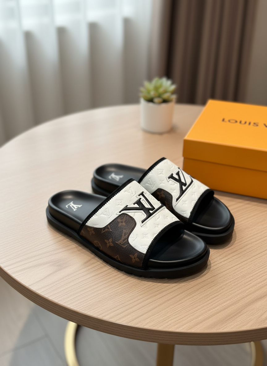 Louis Vuitton Monogram white brown black slides in canvas and leather, featuring iconic LV logo, luxurious yet casual unisex design, stylish comfort for modern outdoor wear.