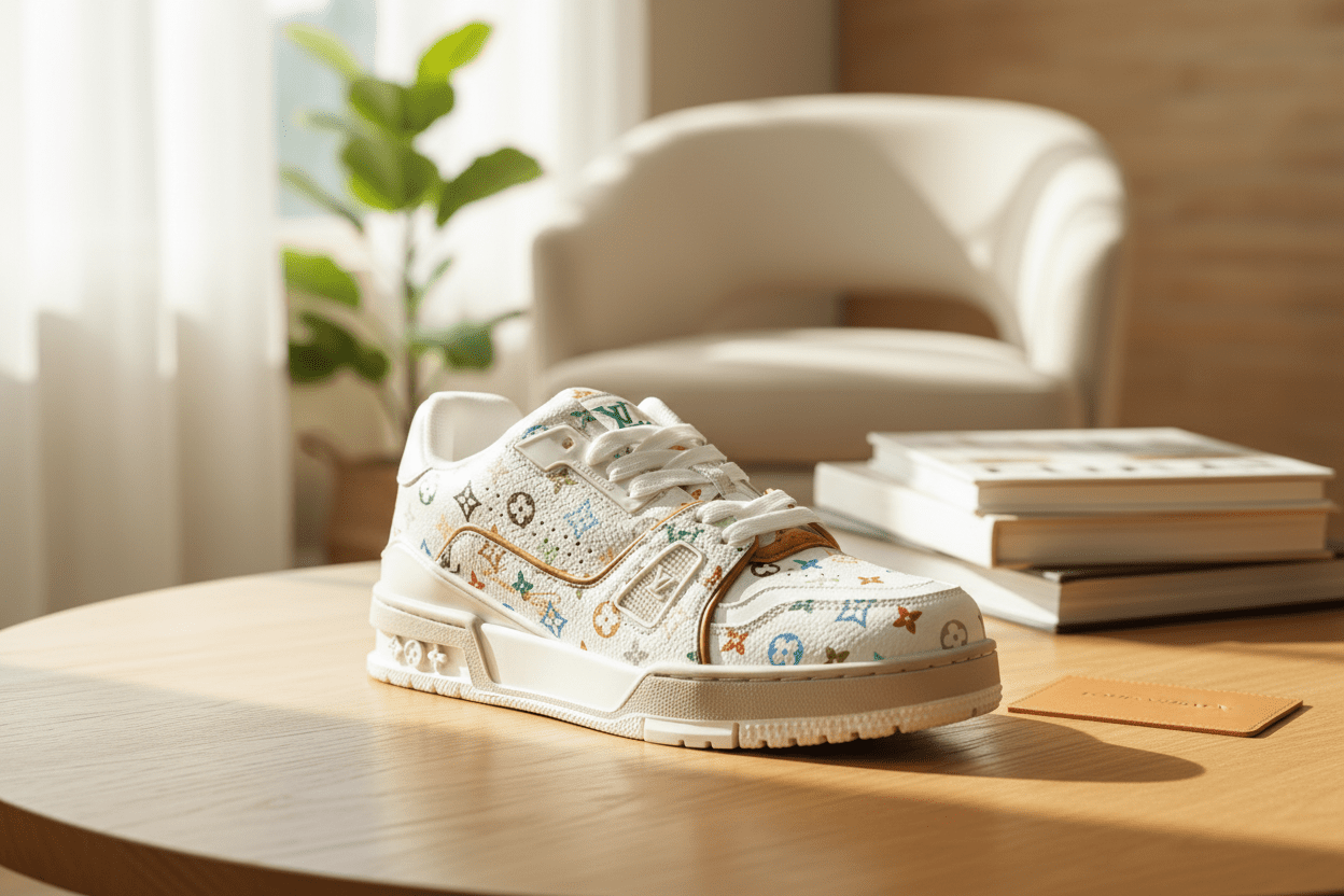 Louis Vuitton Trainer Multicolor Monogram Sneakers crafted from premium leather with the signature Monogram pattern, low-top lace-up design, unisex style blending luxury and street fashion.