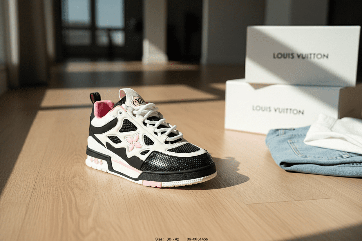 Louis Vuitton Lago Series sneakers feature ivory, black and pink contrast, mesh and leather mix, breathable cut-out design, pink flower motif, unisex, stylish, and comfortable for everyday wear.