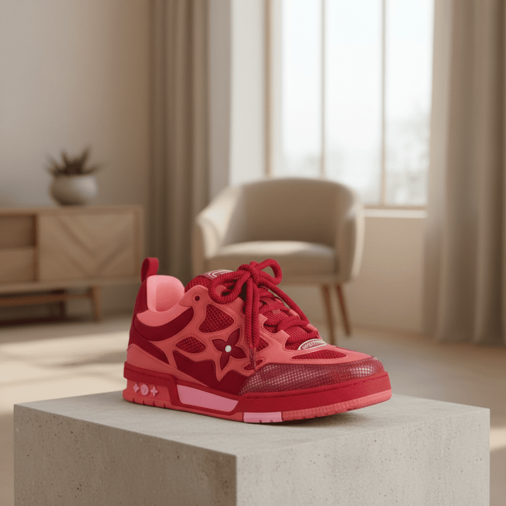 Louis Vuitton Pink Patchwork Sneakers feature mesh and leather design, lace-up closure, signature Monogram flower motif, unisex sporty style, ensuring comfort and luxury for everyday wear.