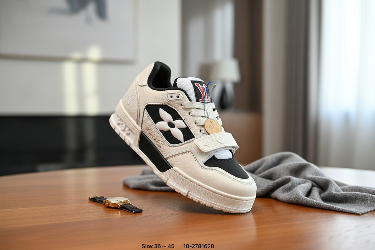Louis Vuitton Trainer sneakers in off-white and black premium leather, featuring iconic Monogram flower, brand embroidery, Velcro strap, unisex design, and a vintage-modern luxury style.