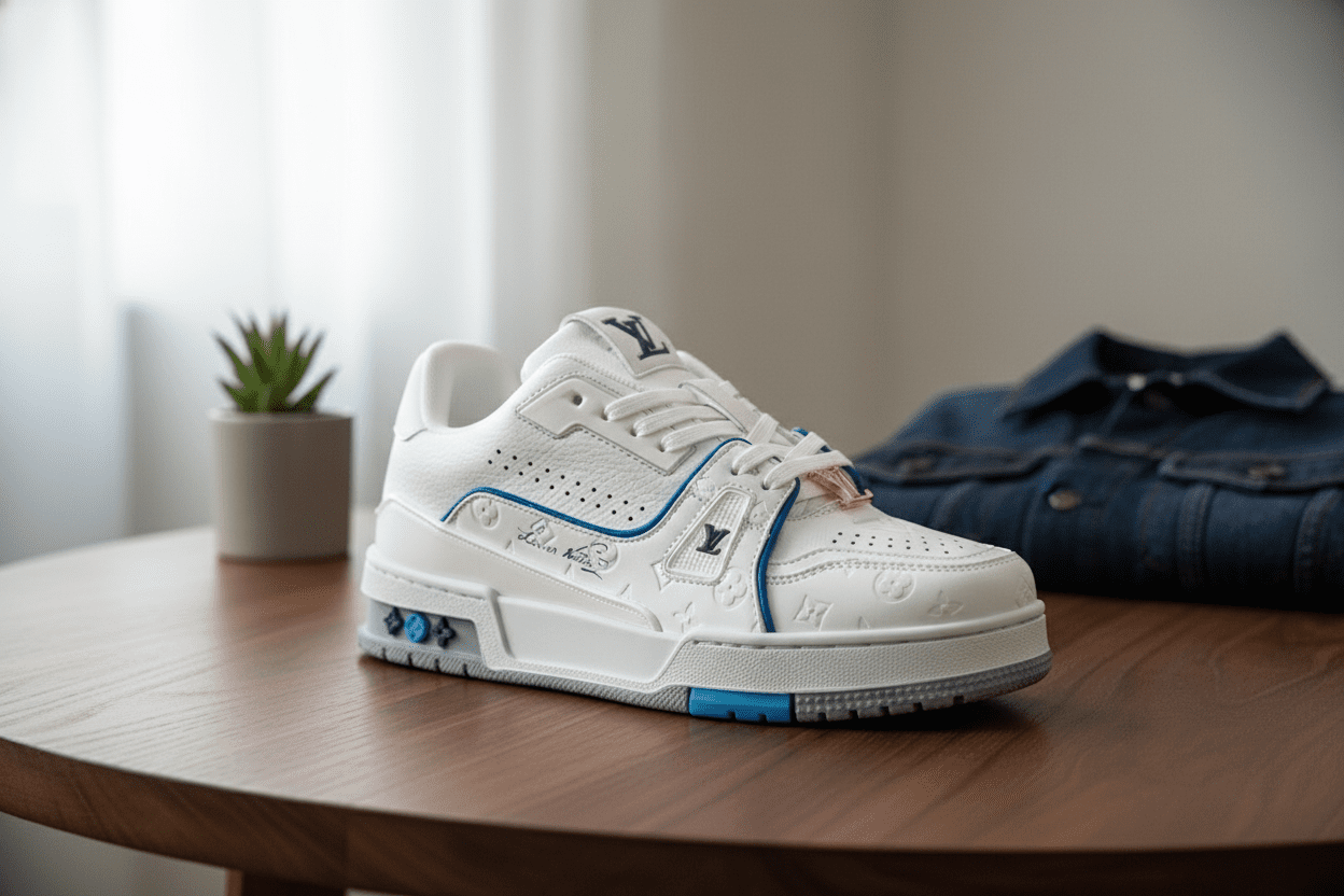 Louis Vuitton Trainer White Sneakers feature premium leather, blue detailing, colorful clover accents, iconic LV logo, breathable comfort, unisex design, and a luxurious modern fashion vibe.
