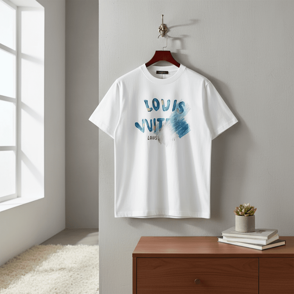 Louis Vuitton white cotton T-shirt, breathable and soft. Features colorful graffiti-style LV letters on front and artistic brushstroke design on back. Unisex trendy casual wear with unique fashion flair.