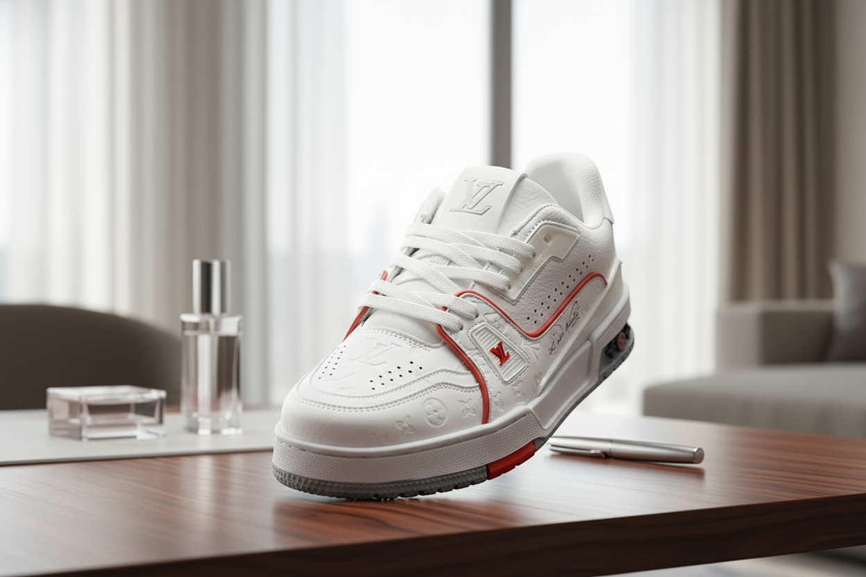 Louis Vuitton Trainer White Sneakers feature premium leather with embossed Monogram pattern, red side trim, colorful sole logo, luxurious unisex design perfect for daily casual wear and sport style.