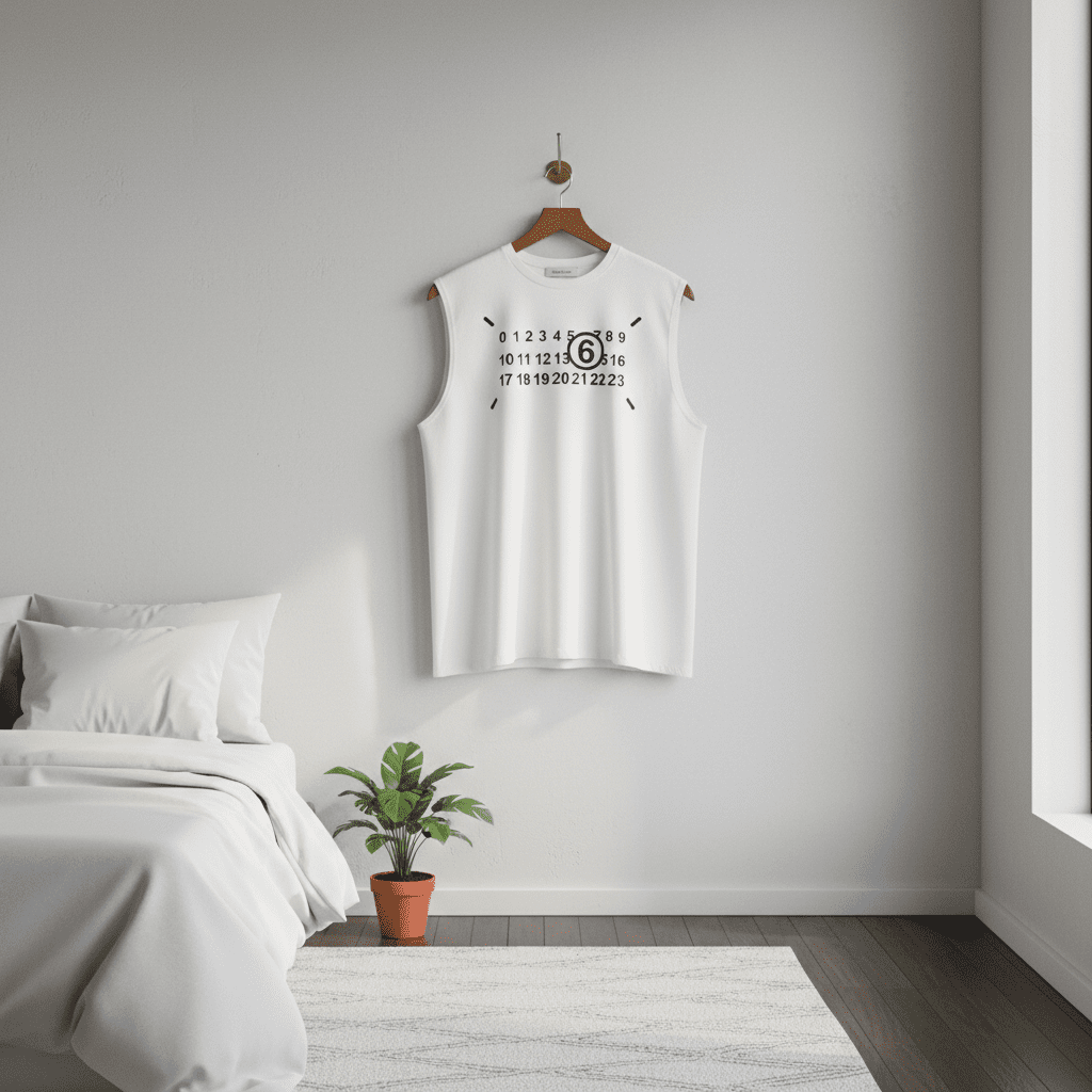 Maison Margiela white sleeveless tank top made from premium breathable cotton, featuring iconic numeric matrix print on the back, minimalist avant-garde unisex design for everyday casual fashion.