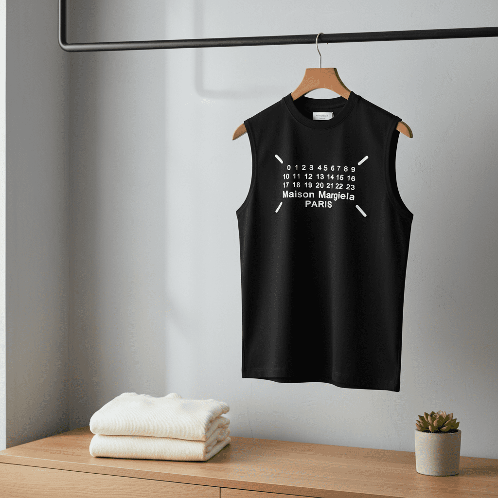 Maison Margiela black sleeveless cotton tank top with signature numeric logo print, soft breathable fabric, unisex minimalist design, perfect for casual everyday wear with iconic brand style.