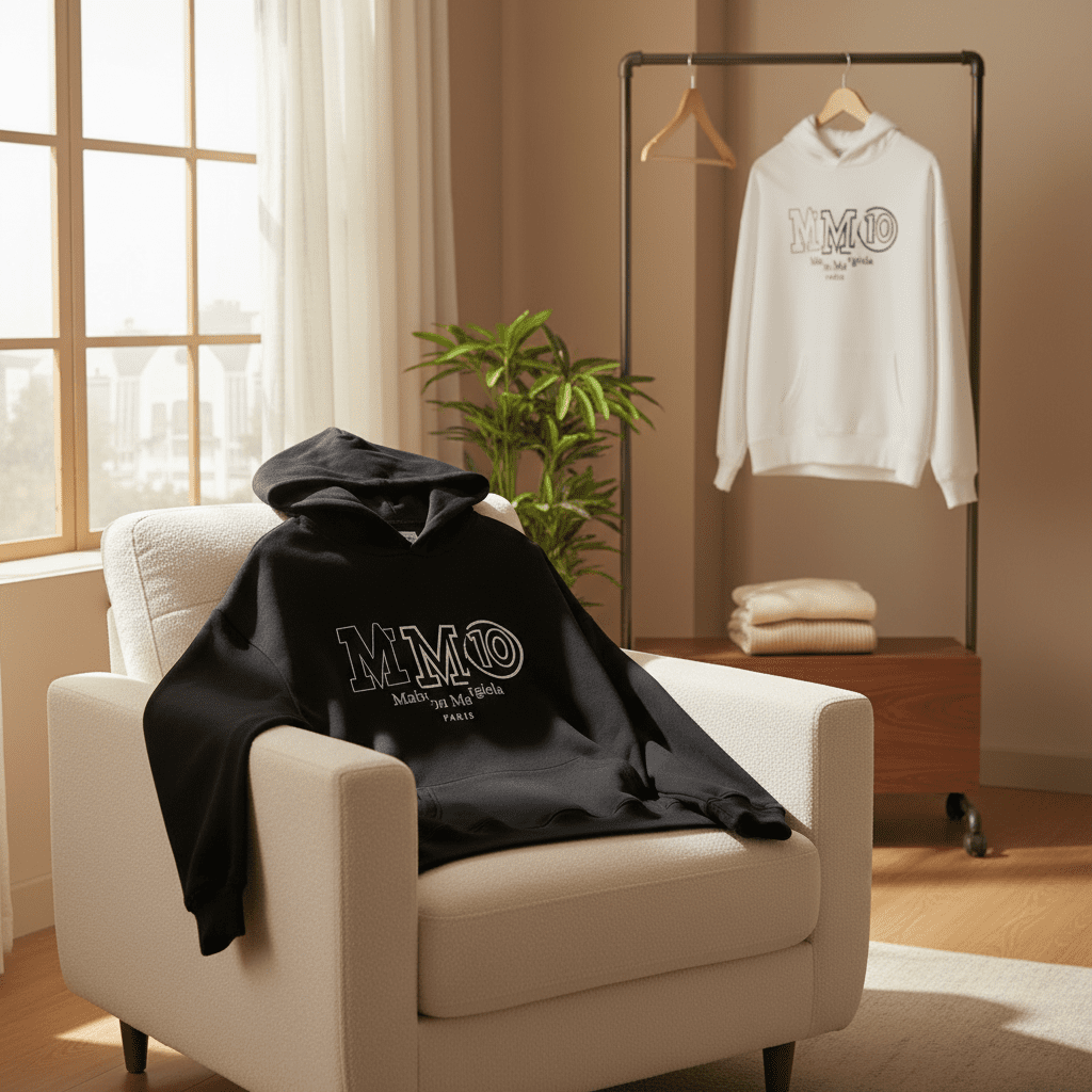 Maison Margiela MM10 Black Hoodie, crafted from soft cotton with MM10 logo print. Unisex casual design, warm and versatile for everyday wear, blending modern minimalism with iconic street style.