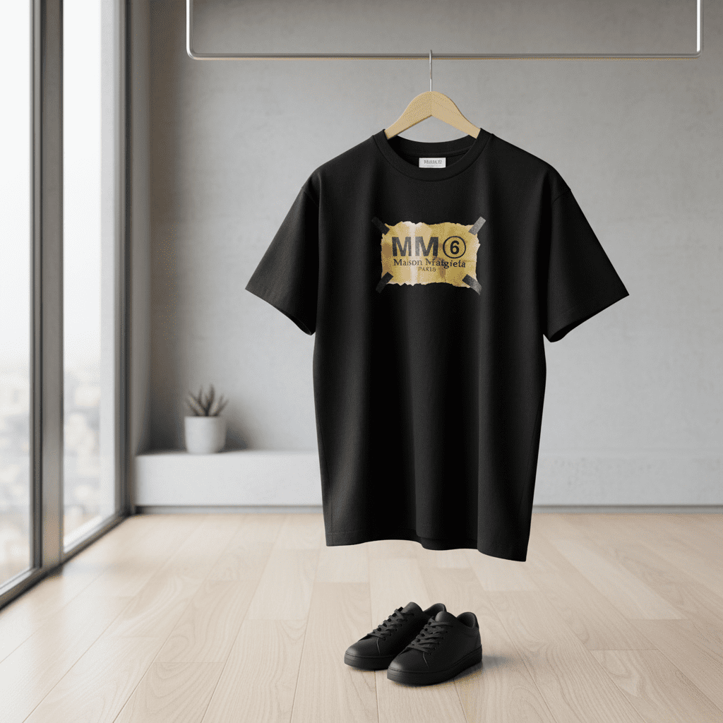 Maison Margiela MM6 black cotton T-shirt with distressed paper print and tape design, unisex avant-garde style, soft and comfortable for everyday wear with a unique fashion edge.