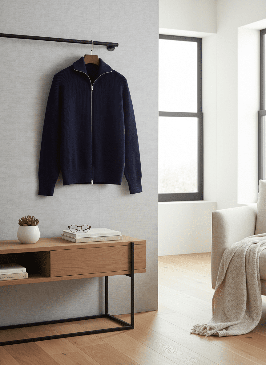 Maison Margiela navy high-neck full-zip knit cardigan, crafted from soft fabric with ribbed cuffs and hem, warm, gender-neutral, minimalist design for daily or office wear, modern luxury style.