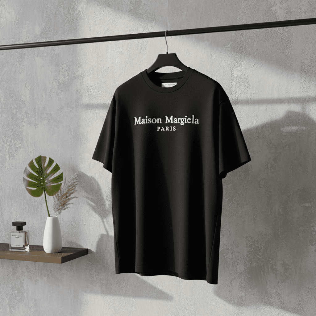 Maison Margiela Black Logo T-Shirt made from premium cotton, featuring a crew neck, short sleeves, and white chest branding. Unisex design for everyday casual wear with timeless minimalist luxury style.