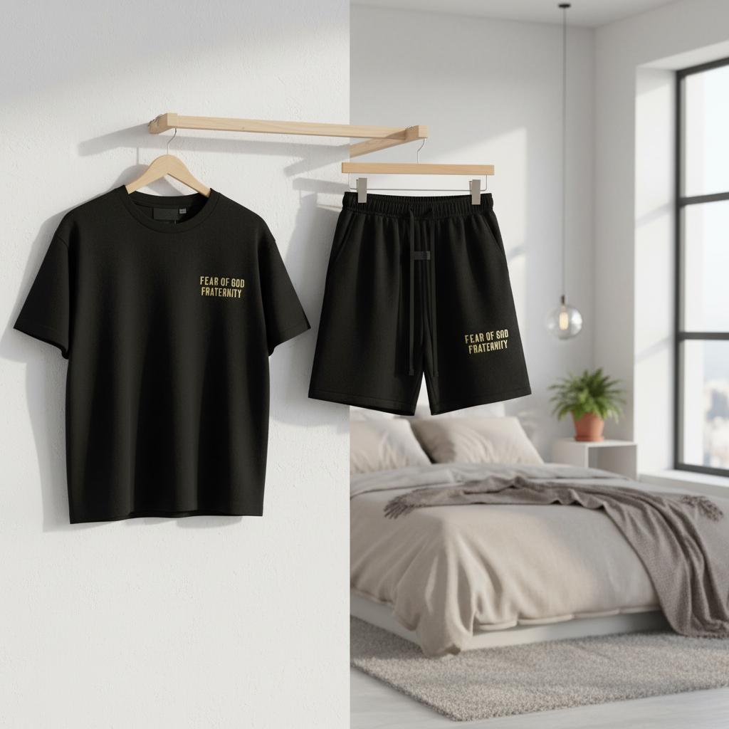 Essentials Fear of God Fraternity black cotton set, featuring breathable soft fabric, minimalist streetwear design with logo prints on tee and shorts, perfect for unisex daily casual style.