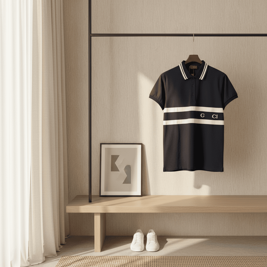 Gucci Classic Navy Polo Shirt made from premium breathable cotton, featuring a striped collar and dual white chest bands with logo detail, offering a timeless, gender-neutral, luxury casual style.