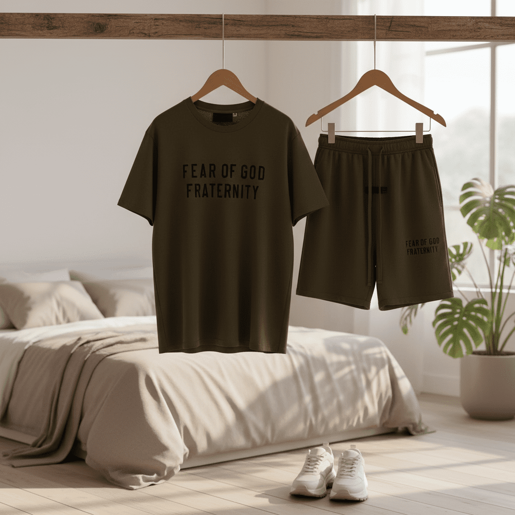Fear of God Essentials Fraternity Olive Green Set, soft breathable cotton T-shirt with letter print and drawstring shorts, unisex streetwear for daily comfort and trendy style.