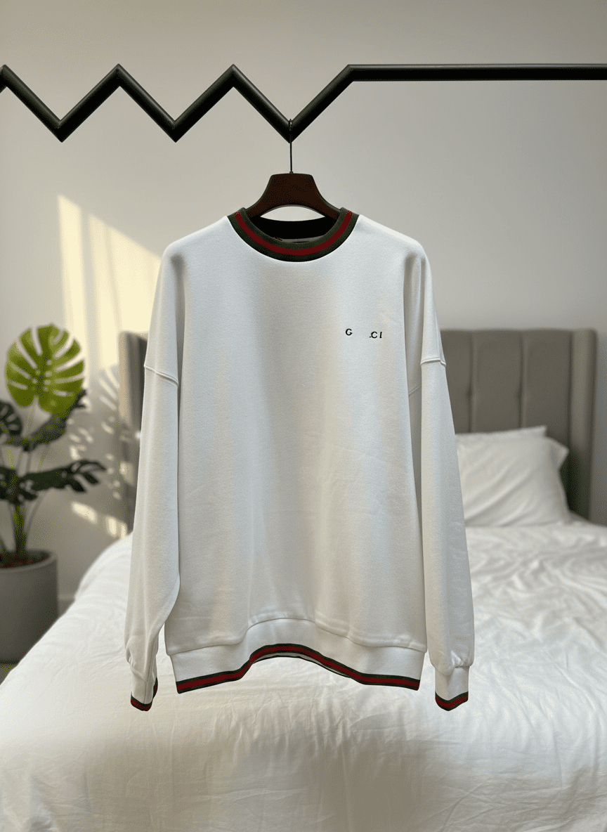Gucci Classic White Cotton Crewneck Sweatshirt featuring red-green striped collar, cuffs and hem, minimalist G CI logo on chest, breathable comfort, unisex luxury style for casual wear.