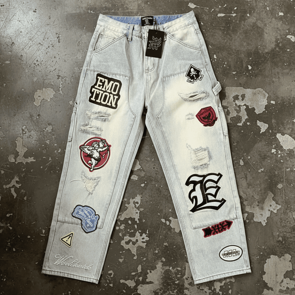 Discover trendy beige denim pants with unique patchwork & distressed details. Perfect for streetwear lovers seeking a bold, relaxed fit.