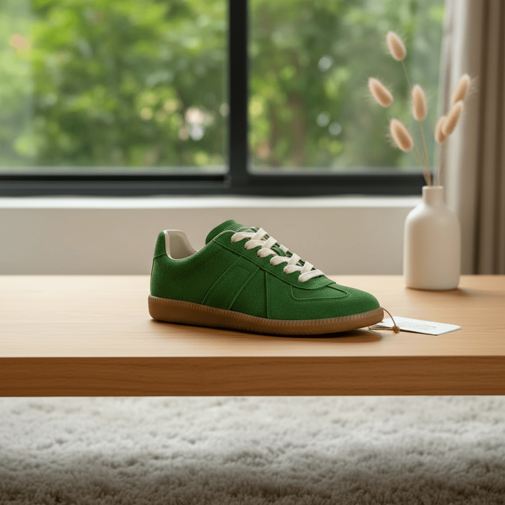 MM6 Maison Margiela green suede sneakers with minimalist design and gum sole, offering a unisex, trendy, and comfortable casual style perfect for everyday wear.