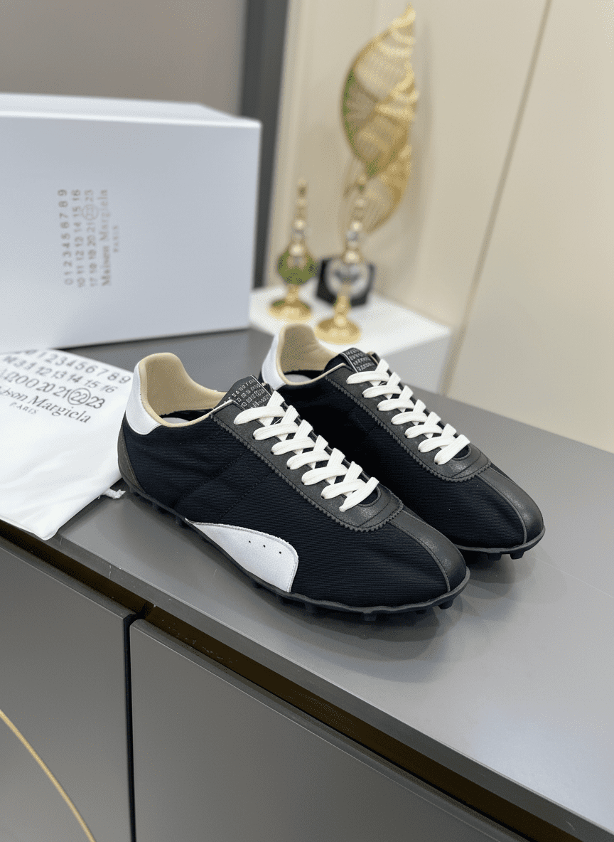 Maison Margiela MM6 black and white sneakers, crafted from leather and fabric, feature a low-top lace-up design, non-slip sole, and minimalist unisex style for daily trendy wear.