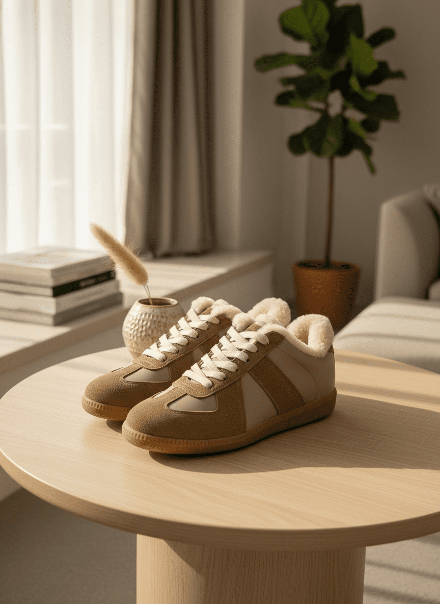 MM6 Maison Margiela khaki gray patchwork sneakers, crafted from suede and leather with cozy shearling lining, lace-up design for men and women, warm and stylish for autumn and winter.