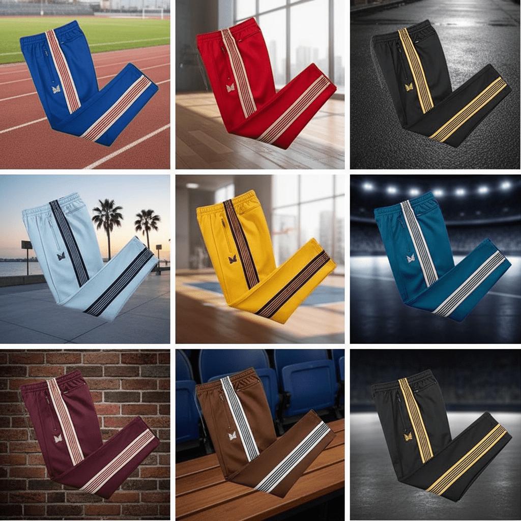 "Iconic side-stripe athletic pants in multiple colors. Comfy, stretchy waist, stylish butterfly logo. Perfect for casual wear & sports. Choose from blue, red, black & more!"