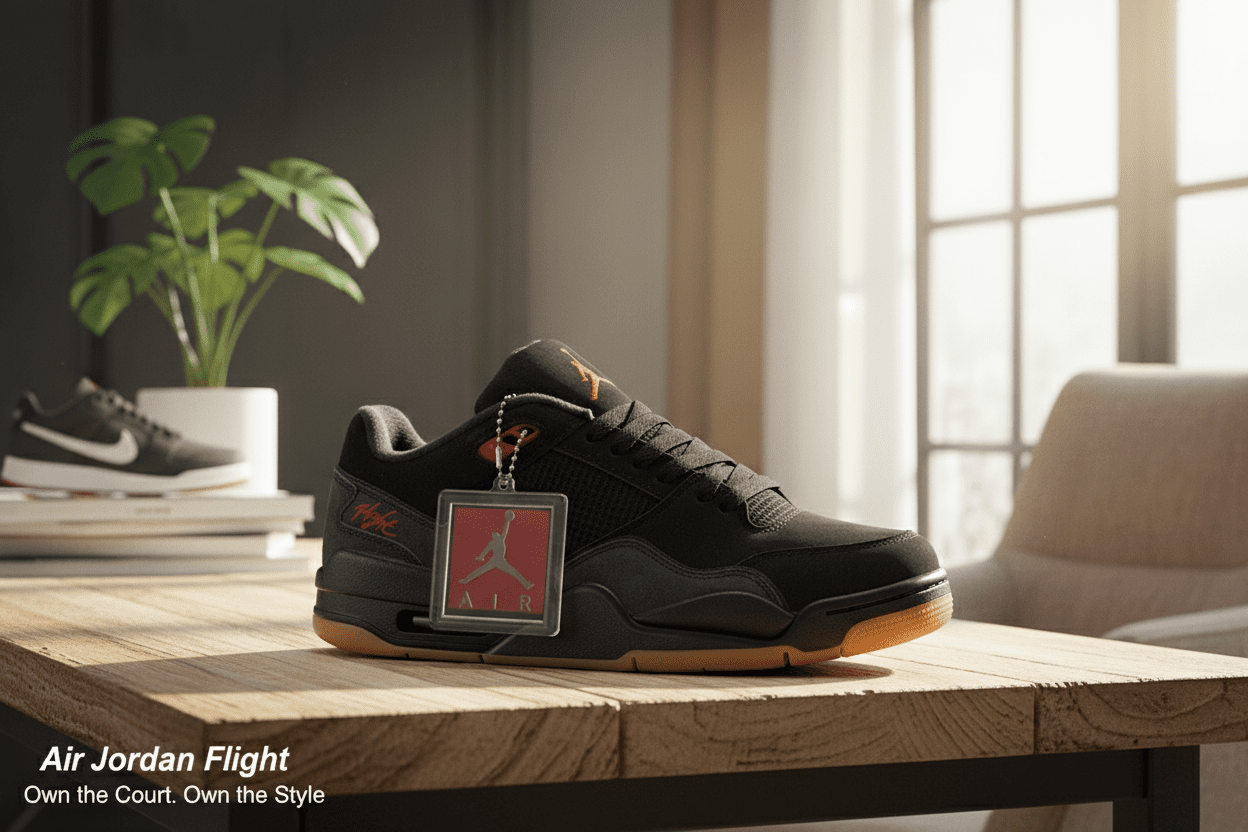 Nike Air Jordan black casual sneakers with suede and mesh design, red details, gum anti-slip sole, iconic Jumpman and Flight logo, unisex street style, stylish, comfortable, and distinctive.