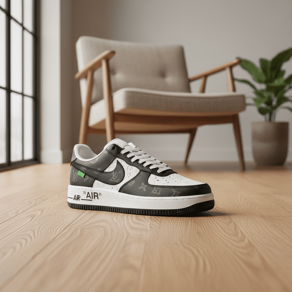 Nike Air Force 1 Black White Sneakers, leather & fabric mix with LV-inspired pattern, “AIR” sole logo, streetwear style, unisex design, trendy and comfortable for everyday wear.