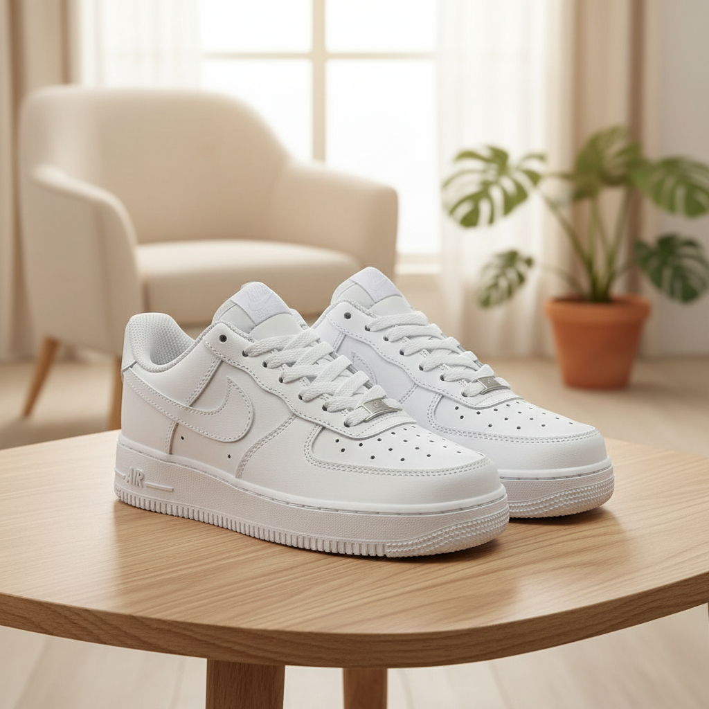 Nike Air Force 1 White Low Sneakers feature premium leather, built-in Air cushioning for comfort, timeless minimalist design, unisex style, and versatile fashion for everyday casual wear.