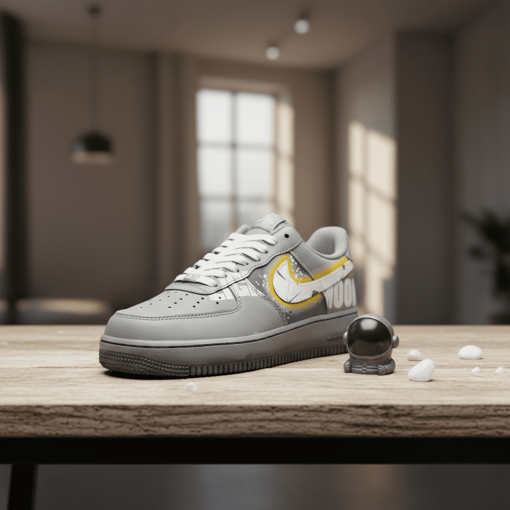 Nike Air Force 1 Grey Gradient Sneakers, premium leather with Air cushioning, MOON lettering and iconic Swoosh design, streetwear-inspired, unisex, stylish, comfortable, and full of personality.