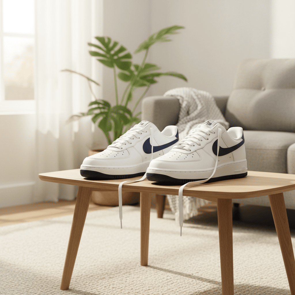 Nike Air Force 1 White Blue Sneakers feature premium leather, classic navy Swoosh, built-in Air cushioning for comfort, unisex design, perfect for streetwear and daily casual style.