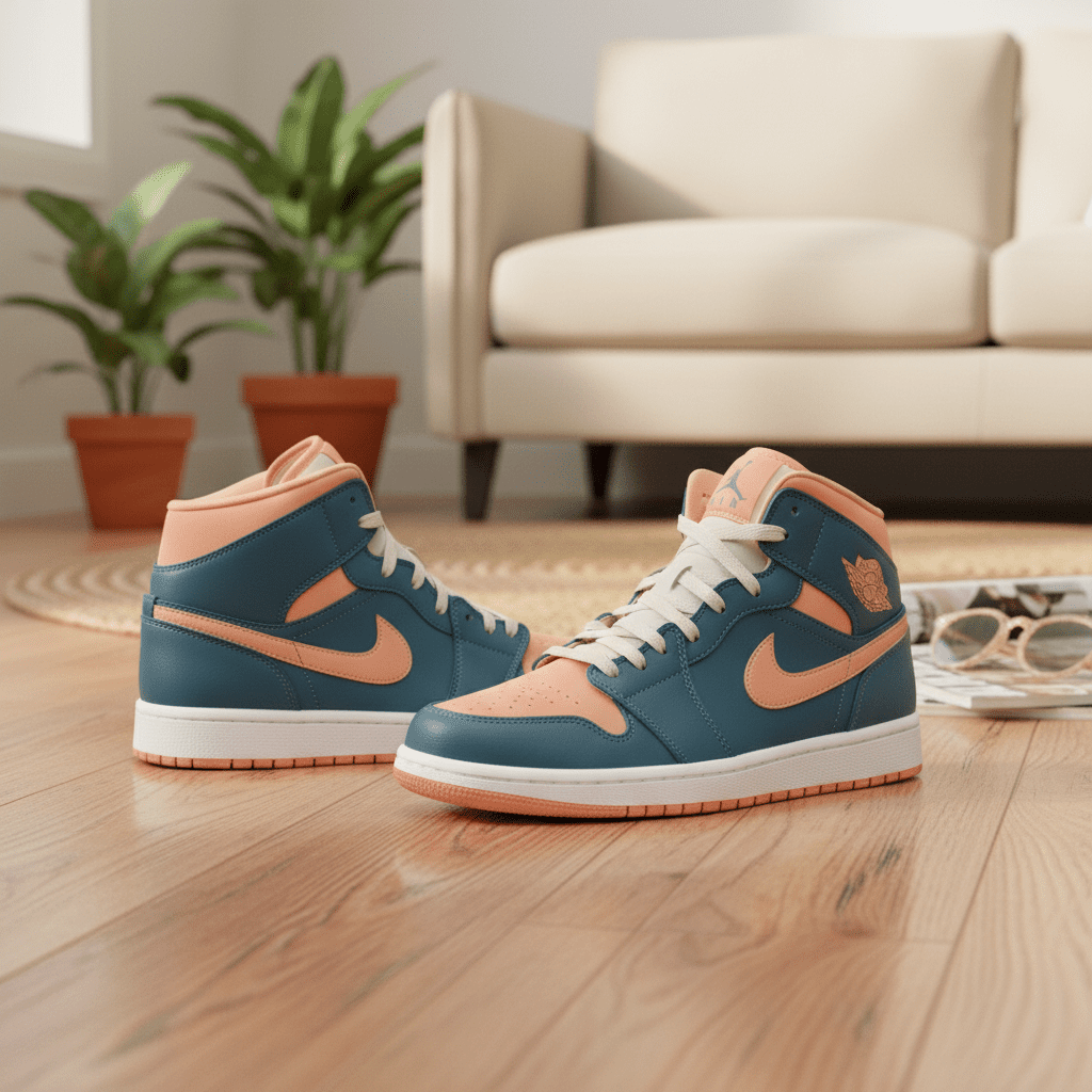 Nike Air Jordan 1 High Sneakers, blue-green and coral orange color block, premium leather, classic Swoosh and Wings logo, street-inspired unisex style, durable comfort, perfect for everyday wear.