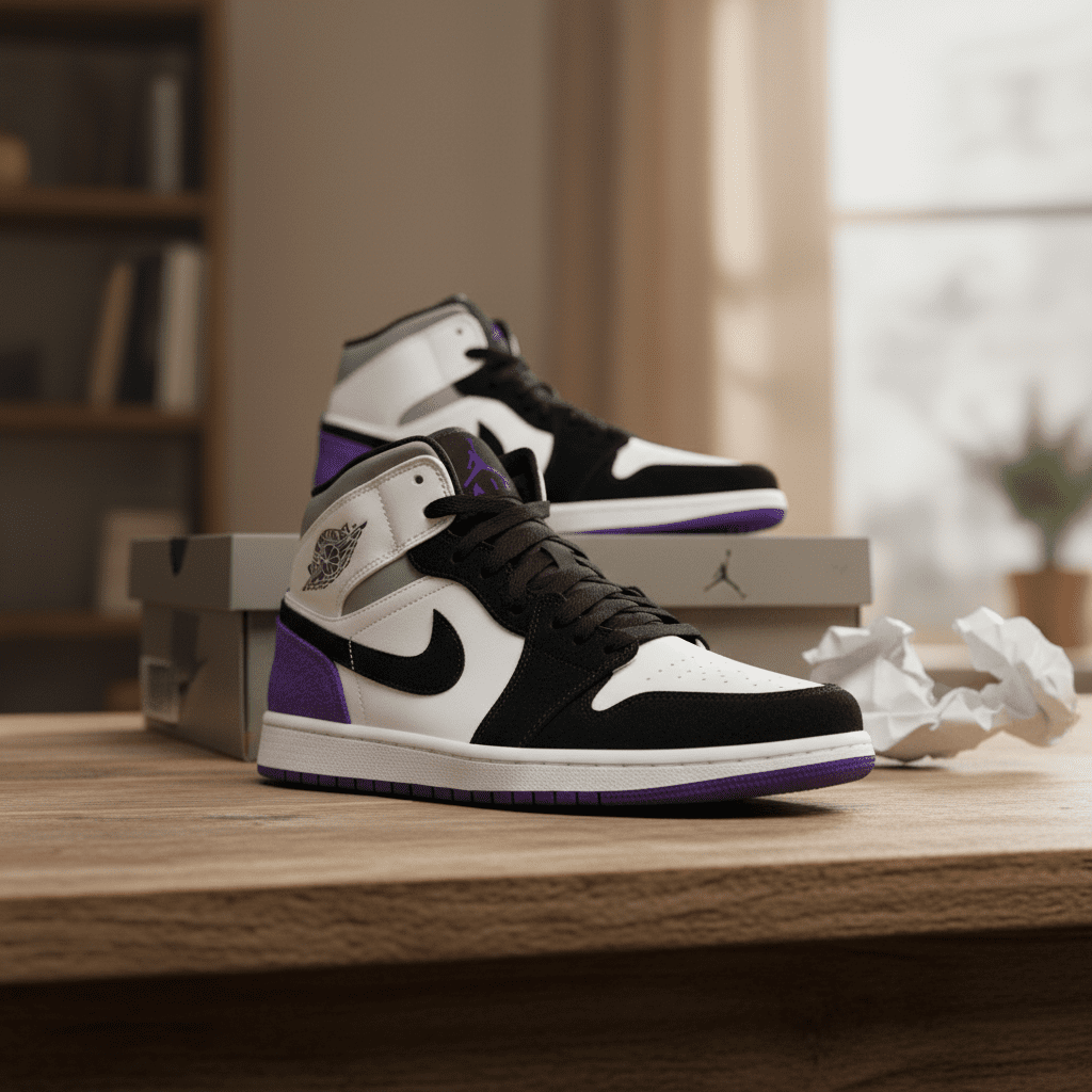 Nike Air Jordan 1 High sneakers feature a white, black, and purple colorway with leather and suede panels, ankle-supporting high-top design, black Swoosh, and purple Wings logo for unisex street style.