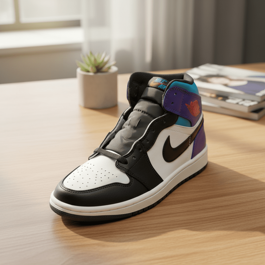 Nike Air Jordan 1 High sneakers in black, gray, white, purple, blue, and green leather, classic high-top design with iconic Swoosh and red Wings logo, cushioned comfort, retro street style for men and women.