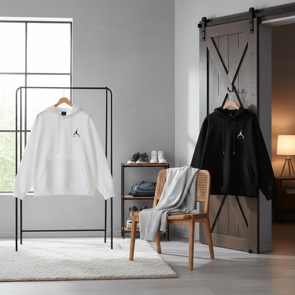 Nike Air Jordan White Hoodie, made from soft breathable cotton, features classic drawstring hood, Jumpman logo on chest, and kangaroo pocket. Street style unisex design for casual comfort.