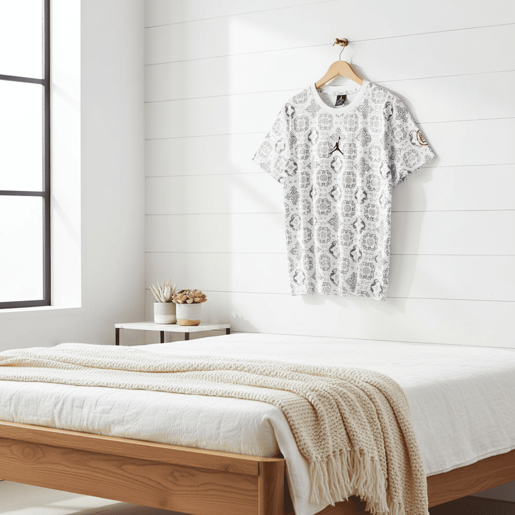 Nike Jordan Series White T-Shirt, made of soft breathable cotton, features black and white geometric prints with the iconic Jumpman logo. Unisex streetwear for casual, stylish everyday looks.