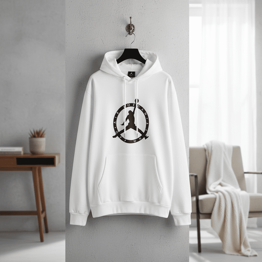 Nike Air Jordan White Hoodie features breathable cotton blend, adjustable drawstring hood, practical kangaroo pocket, iconic Jumpman logo design, unisex fit, perfect for casual streetwear style.