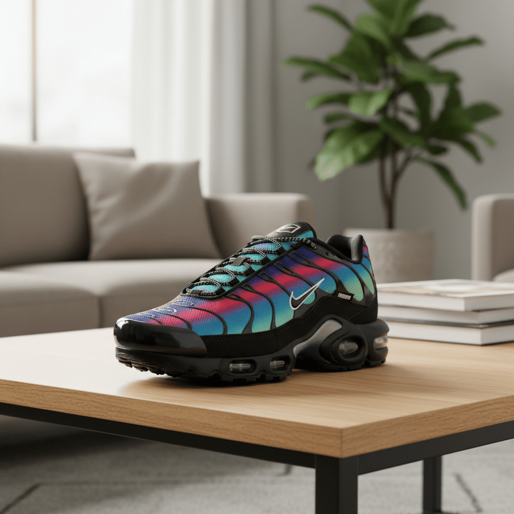 Nike Air Max Plus Gradient Rainbow Sneakers feature mesh and synthetic upper, wave design with Air cushioning, classic Swoosh and “FREEDOM” detail, stylish unisex comfort for sport and street style.
