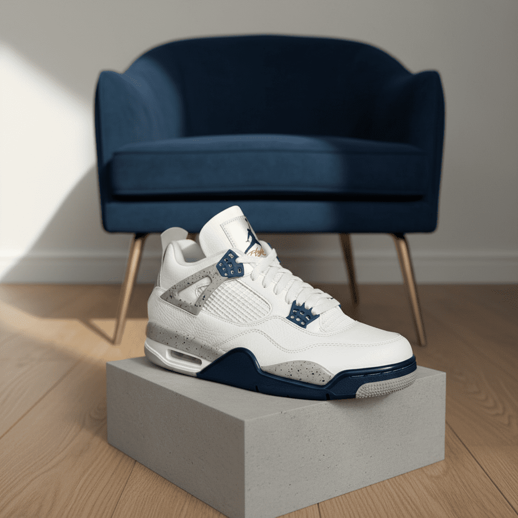 Nike Air Jordan 4 White Blue Grey Sneakers feature leather and mesh panels, Air cushioning for comfort, speckled details, and a classic sporty unisex design blending fashion and performance.