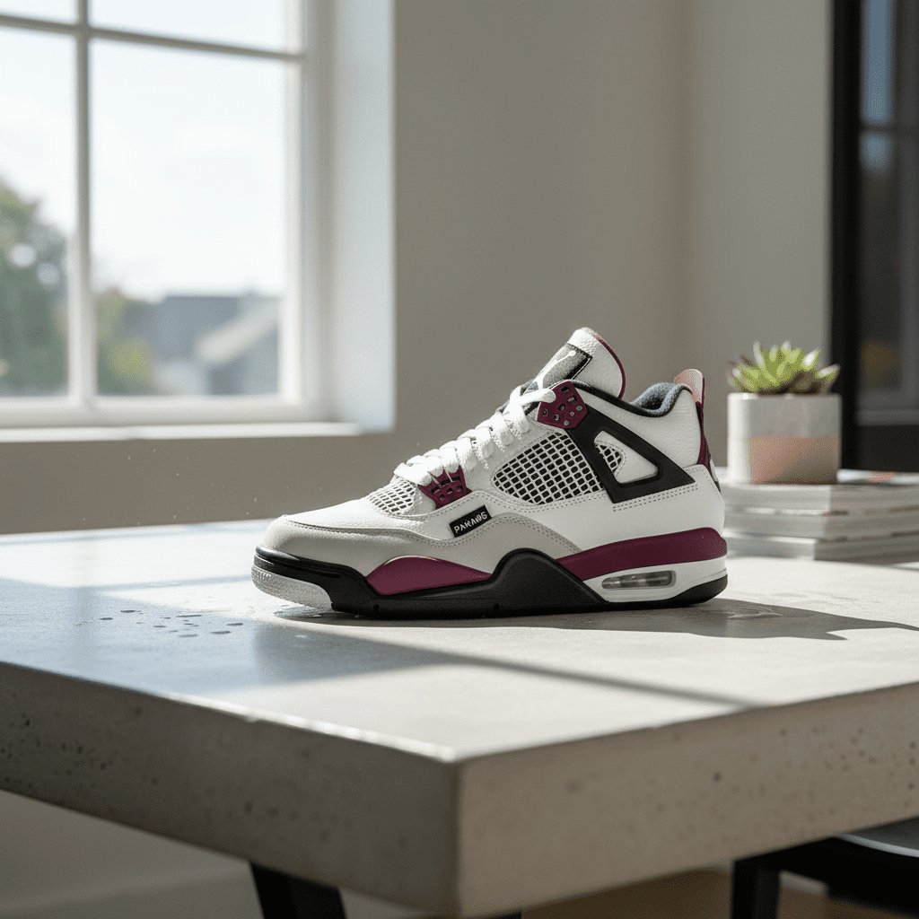 Nike Air Jordan 4 White Wine Red Black Grey sneakers feature leather and mesh upper, Air cushioning, supportive wings, PANAME tag, and breathable style for unisex comfort and street fashion.