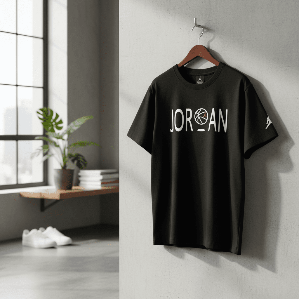 Nike Jordan black cotton T-shirt with white JORDAN basketball graphic, sleeve Jumpman logo, breathable and soft fabric, unisex athletic casual style, perfect for everyday wear.