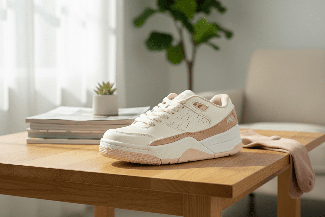 Nike Women’s Off‑White & Nude Pink Casual Sneakers – synthetic leather and suede upper, breathable perforations, thick sole for comfort and style, durable, trendy everyday wear with chic appeal.