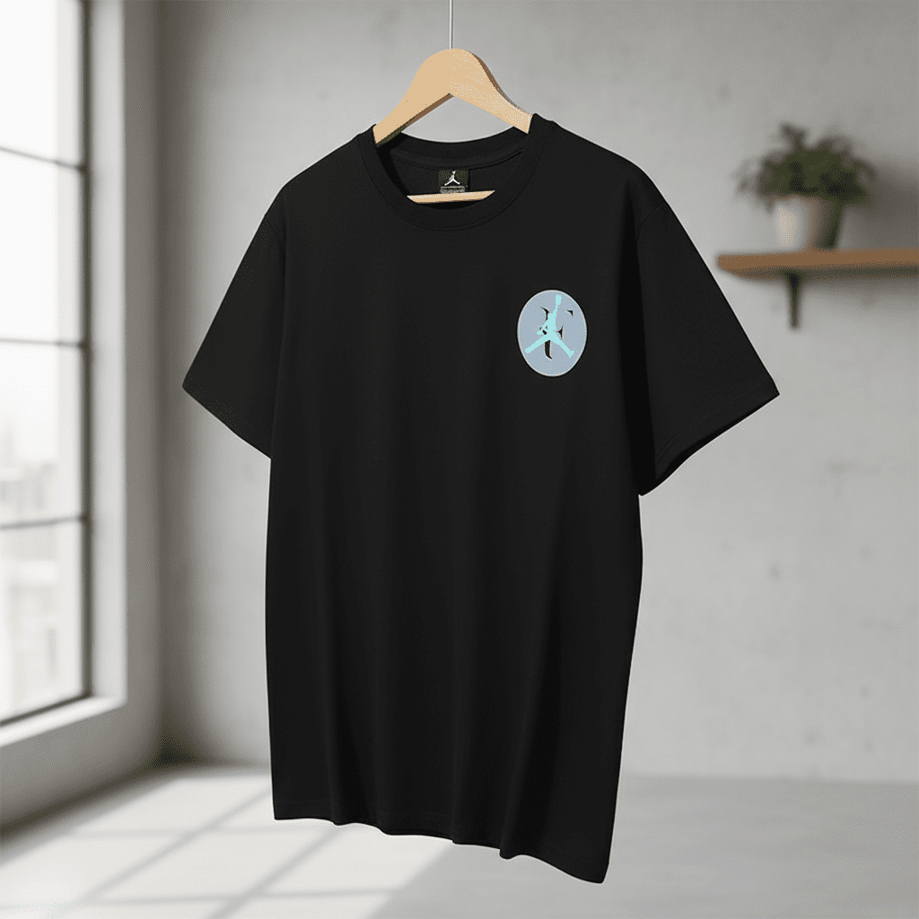 Nike Jordan black cotton T-shirt with light blue Jumpman circle logo, classic crew neck, breathable and soft, unisex streetwear style for casual and sporty everyday looks.