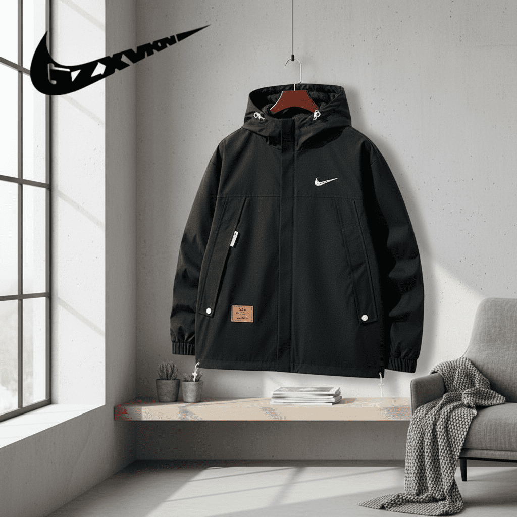 Nike Black Hooded Windproof Jacket – made of breathable fabric with adjustable drawstring hood, white Swoosh logo on chest, leather tag at hem, unisex streetwear style, comfy for daily wear.